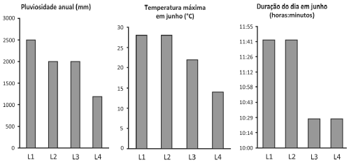 Os gráficos mostram informações sobre fatores abióticos de quatro locais (L1 a L4), todos eles cobertos por vegetação nativa. A duração do dia é mostrada como o tempo decorrido entre o nascer e o pôr do sol.