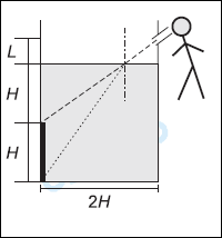 Através de um tubo fino, um observador enxerga o topo de uma barra vertical de altura H apoiada no fundo de um cilindro vazio de diâmetro 2H. O tubo encontra-se a uma altura 2H + L e, para efeito de cálculo, é de comprimento desprezível. Quando o cilindro é preenchido com um líquido até uma altura 2H (veja figura), mantido o tubo na mesma posição, o observador passa a ver a extremidade inferior da barra. Determine literalmente o índice de refração desse líquido.