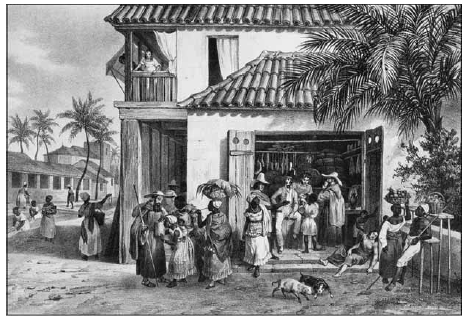 I: “Como em todas as lojas, o mercador se posta por trás de um balcão voltado para a porta, e é sobre ele que distribui aos bebedores a aguardente chamada cachaça, cujo sabor detestável tem algo de cobre e fumaça.”