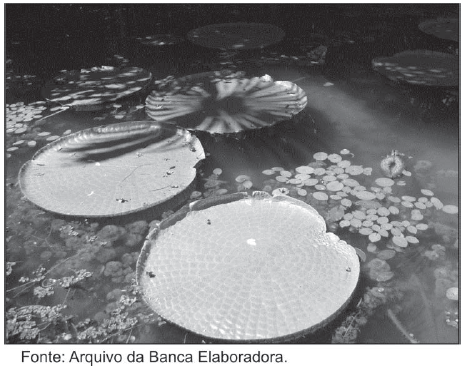 Na vitória-régia, mostrada na figura abaixo, os estômatos localizam-se na superfície superior da folha, o que acontece também em outras plantas aquáticas.