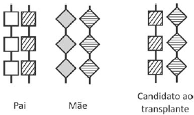 São representados, a seguir, o genótipo de um candidato a transplante de medula óssea e os genótipos de seus genitores, quanto a esse haplótipo.