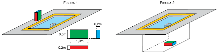 Uma caixa de massa 150 kg, com faces retangulares pintadas nas cores verde, vermelho e azul, está apoiada na borda plana e horizontal de uma piscina, sobre uma de suas faces azuis, conforme a figura 1, que também indica as dimensões de cada uma das faces da caixa. Na situação da figura 2, a caixa está dentro da piscina, totalmente submersa e apoiada no fundo, em repouso, sobre uma de suas faces verdes.