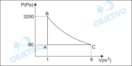 Uma máquina térmica opera com um moI de um gás monoatômico ideal. O gás realiza o ciclo ABCA, representado no plano PV, conforme mostra a figura. Considerando que a transformação BC é adiabática, calcule: