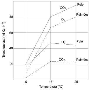 Três grupos de sapos foram mantidos em três temperaturas diferentes: 5ºC, 15ºC e 25ºC. O gráfico abaixo foi construído a partir das medidas das quantidades de gases trocados entre os animais e o ambiente em cada uma dessas temperaturas.