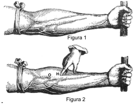 As figuras abaixo ilustram um experimento realizado por William Harvey, cientista inglês do século XVII, que desvendou aspectos importantes da circulação sanguínea humana. Harvey colocou um torniquete no braço de uma pessoa, o que fez certos vasos sanguíneos tornarem-se salientes e com pequenas protuberâncias globosas (Fig. 1). Ele pressionou um vaso em um ponto próximo a uma protuberância e deslizou o dedo em direção à mão (de O para H na Fig. 2) de modo a espremer o sangue. O vaso permaneceu vazio de sangue entre O e H, enquanto a pressão sobre esse último ponto foi mantida.