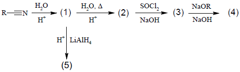 Dadas as reações orgânicas abaixo, desenhe as estruturas planas dos compostos (1) a (5).