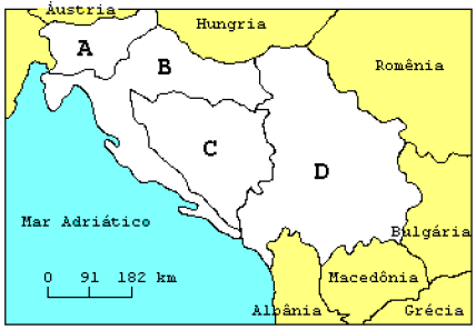 a) Identifique os países A – B – C e D que faziam parte da República Popular da Iugoslávia e a região da Europa onde estão situados.