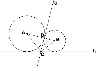 b) A reta t2 é tangente às circunferências no ponto D.