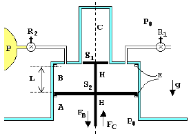 Inicialmente, com o registro R1 aberto e R2 fechado, os êmbolos deslocam-se lentamente para cima, puxando o mecanismo externo com uma força constante FC. No final do percurso, R1 é fechado e R2 aberto, de forma que os êmbolos deslocam-se para baixo, empurrando o mecanismo externo com uma força constante FB. (Considere a temperatura como constante e a pressão ambiente como P0 = 1,0 x 105 Pa. Lembre-se de que 1 Pa = 1 N/m2).