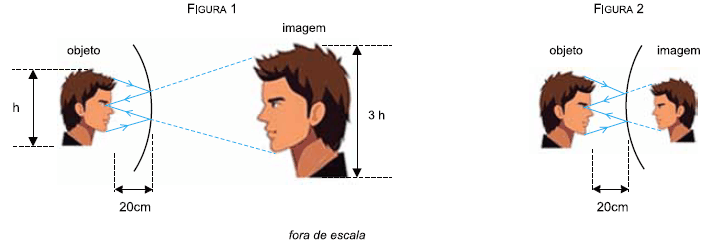 Uma calota esférica é refletora em ambas as faces, constituindo, ao mesmo tempo, um espelho côncavo e um espelho convexo, de mesma distância focal, em módulo. A figura 1 representa uma pessoa diante da face côncava e sua respectiva imagem, e a figura 2 representa a mesma pessoa diante da face convexa e sua respectiva imagem.
