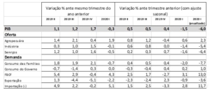A economia brasileira contraiu 1,5% no 1º trimestre de 2020 em comparação com o trimestre anterior, ajustado sazonalmente. Em comparação com o mesmo período de 2019 a queda foi de 0,3%.