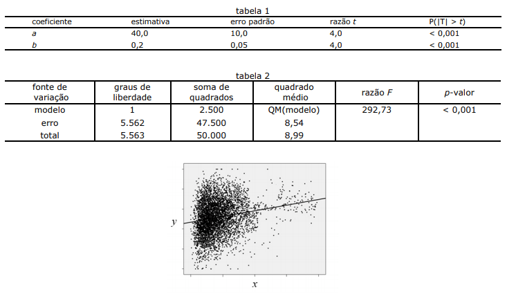 Um estudo sobre a qualidade da gestão pública em programas de assistência social considerou um modelo de regressão linear simples na forma yk = a + bxk + gk, em que yk é um indicador que representa a capacidade administrativa do município k, a variável regressora xk denota o valor do gasto público per capta do município k em programas de assistência social, e k = 1, 2, …, 5.564. Os coeficientes do modelo são representados por a e b, e gk representa o erro aleatório com média zero e variância constante. Sob a hipótese de que esses erros aleatórios sejam normais (independentes e identicamente distribuídos), a tabela 1 abaixo mostra as estimativas dos coeficientes — que foram obtidos pelo método dos mínimos quadrados ordinários — e a tabela 2 apresenta o resultado da análise de variância (ANOVA). A Figura 1 mostra o diagrama de dispersão entre as variáveis yk e xk e um esboço da reta ajustada.