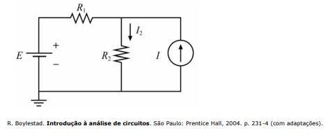 Os diagramas de comando de uma máquina elétrica contêm um circuito em que há uma fonte de corrente e uma fonte de tensão. Um engenheiro, interessado em saber a corrente total em determinado resistor, decidiu, como estratégia, utilizar o princípio da superposição. Para tanto, ele usou o circuito ilustrado na figura a seguir, que é um redesenho de parte do circuito de comando da máquina.