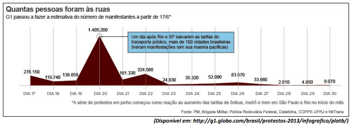 (Disponível em: http://g1.globo.com/brasil/noticia/2013/07/organizados-por-sindicatos-mais-de-100-mil-protestam-em-150-cidades.html. Acesso em: 11/07/2013.)