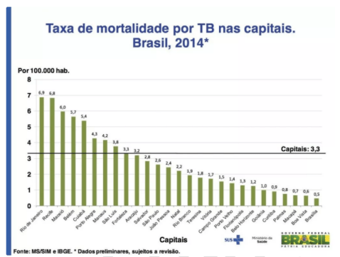 De acordo com o gráfico, em 2014, o Rio de Janeiro era a capital com maior taxa de mortalidade por tuberculose no país (VIGNA, 2016). A taxa nacional de incidência de tuberculose tem baixado desde 2001. Foi de 41 por 100 mil habitantes para 33,8 em 2014. De acordo com reportagem “Rio, recordista de tuberculose em tempos olímpicos”, de Anne Vigna, no Publica (Agência de Jornalismo), no Rio, os índices continuam muito altos, em especial entre as populações marginalizadas: habitantes de favelas, moradores de rua e a população carcerária.