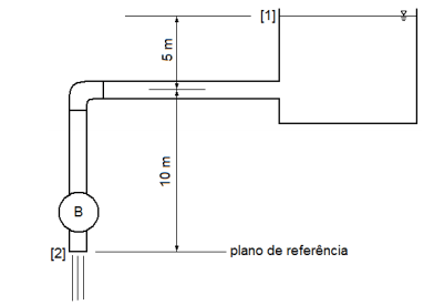 Na instalação da figura, utiliza-se uma bomba como máquina de fluxo para escoar água da seção [1] para seção [2] . A potência da bomba é 15 kW e sua eficiência é 80%.