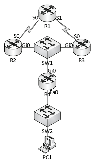 As conexões entre R1 e R2 e entre R1 e R3 são links dedicados ponto-a-ponto. A conexão entre R2, R3 e R4 é um link Ethernet Gigabit realizada por meio do switch SW1. A interface FastEthernet de R4 está conectada ao switch SW2 utilizando protocolo IEEE 802.1Q.