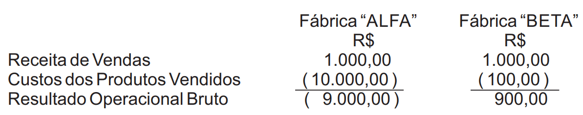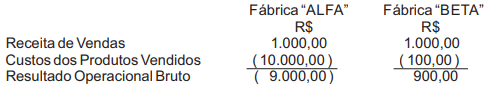 Duas empresas fabris, ALFA e BETA, possuem um custo de produção total de R$ 10.000,00 por mês e produziram, em um determinado mês, 1 (uma) e 100 (cem) unidades, respectivamente. Ambas as fábricas venderam, no mês, apenas 1 (uma) unidade pelo preço de R$ 1.000,00. De acordo com o custeamento convencional, as respectivas Demonstrações do Resultado do Exercício estavam assim elaboradas: