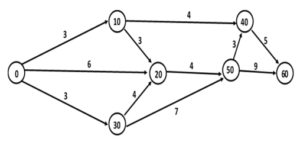 A figura abaixo mostra uma rede em que as atividades, representadas por setas, possuem duração, em dias corridos, representada pelo número no centro da seta. Os círculos mostram as incidências de início e término das atividades e o projeto se inicia em 0 e termina em 60.
