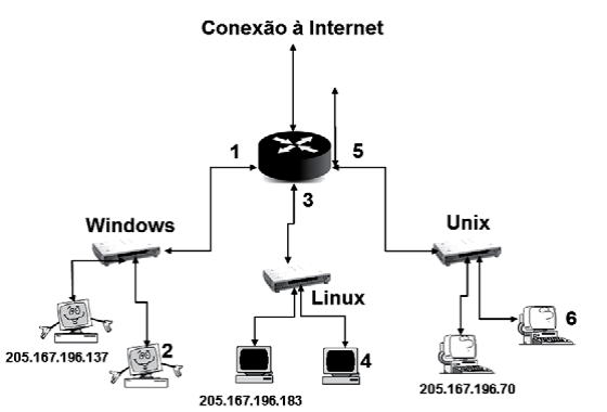 Um Analista administra a rede de computadores da empresa RIONETINFO, estruturada conforme o esquema abaixo, usando o esquema de MÁSCARA DE TAMANHO FIXO, constituída de 3 sub-redes (Windows, Linux e Unix), e que permite acesso à internet, operando sob o protocolo TCP/IP.