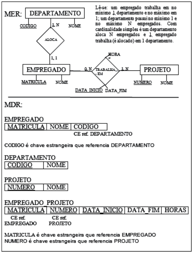 • A especificação das tabelas do MDR, iniciando com os atributo(s) que forma(m) a chave primária, sublinhado(s), e os atributo(s) que forma(m) a chave estrangeira com a indicação de que aquele(s) atributo(s) pertence(m) a uma chave estrangeira e que referencia(m) a tabela tal (em uma forma abreviada seria: CE ref. TAL), no final da tabela. Para melhor entendimento, especificar, em cada tabela, o atributo que é a chave estrangeira (se chave composta, separar os atributos com vírgula) e qual tabela referencia.