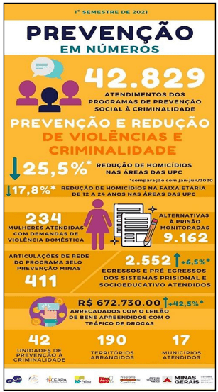 Entre janeiro e junho deste ano foram realizados 42.829 atendimentos pelos seis programas integrantes da política: ‘Fica Vivo!’; ‘Programa Mediação de Conflitos (PMC)’; ‘Central de Acompanhamento de Alternativas Penais (Ceapa)’; ‘Programa de Inclusão Social de Egressos do Sistema Prisional (PrEsp)’; ‘Programa Se Liga’; e, ‘Selo Prevenção Minas’. Atualmente, 42 Unidades de Prevenção à Criminalidade (UPCs) atuam em 190 territórios de 17 municípios mineiros.