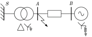 Considere o sistema de potência ilustrado a seguir, no qual uma subestação (barra S) supre um motor síncrono (barra B) através de um ramal alimentado pelo secundário de um transformador abaixador (barra A).