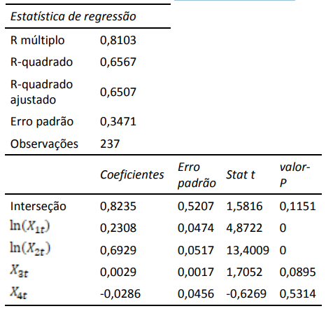 Admita-se que foram verificadas todas as hipóteses do Modelo de Regressão Linear Clássico – MRLC. Os resultados obtidos encontram-se nas tabelas a seguir.