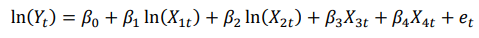 sendo que Yt é o valor do crédito concedido, Y1t é o rendimento anual do cliente, Y2t é o valor de compra do imóvel, Y3t é a porcentagem das outras obrigações financeiras do cliente no seu rendimento (varia de 0 a 100) e Y4t é uma varável binária que assume valor 1, se o cliente tiver mais de 50 anos, e assume valor zero, caso contrário, e ln representa o logaritmo natural da variável.