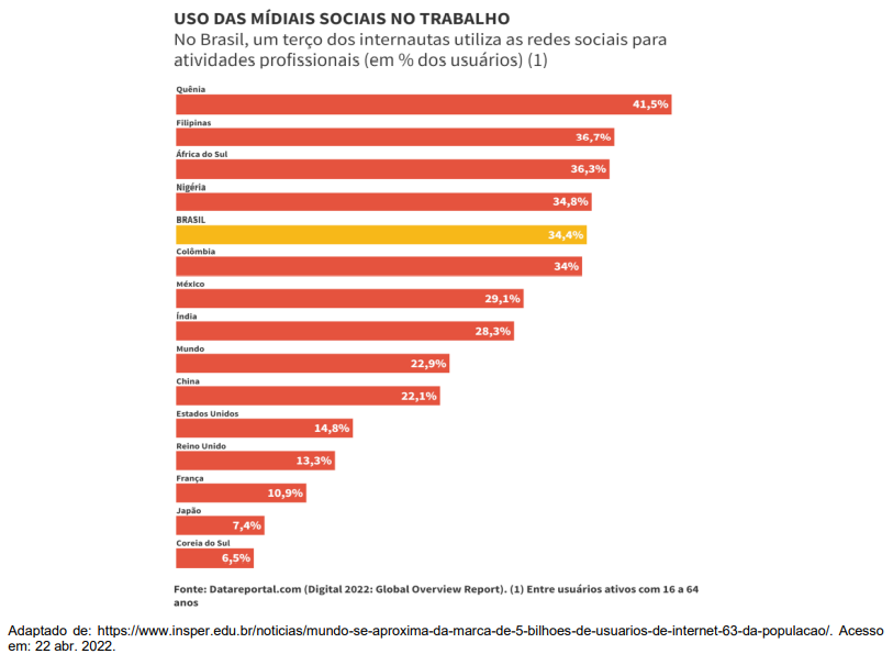 Outros dados do relatório mostram que há globalmente mais de 4,6 bilhões de usuários de mídia social. Esse número cresceu em média 12% ao ano na última década. Somente no ano passado, 424 milhões de pessoas passaram a acessar mídias sociais, o que representou uma média de mais de 1 milhão de novos usuários que aderiram às plataformas sociais a cada dia. Do tempo que os internautas passam online, em torno de 35% é dedicado às mídias sociais.