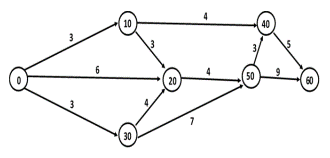 A figura abaixo mostra uma rede em que as atividades, representadas por setas, possuem duração, em dias corridos, representada pelo número no centro da seta. Os círculos mostram as incidências de início e término das atividades e o projeto se inicia em 0 e termina em 60.