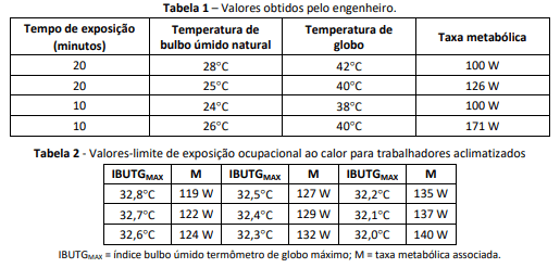 Em uma empresa, a atividade laboral exercida internamente foi monitorada por um engenheiro de segurança do trabalho, que avaliou a temperatura de bulbo úmido natural, a temperatura de globo e as taxas metabólicas relativas às atividades exercidas pelo trabalhador em um intervalo de 1 hora, como indicado na Tabela 1.