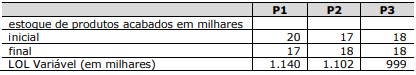 Uma empresa industrial utiliza o sistema de custeio por absorção, para a elaboração de seus relatórios financeiros, e o sistema de custeio variável, para fins gerenciais. Nos últimos três períodos contábeis, a empresa manteve seus custos fixos de produção estáveis, no nível de R$ 60,00, por unidade fabricada. Toda a produção iniciada em cada período foi concluída no próprio período. Os estoques de produtos acabados oscilaram ao longo desses períodos, assim como o lucro operacional líquido (LOL) apurado para fins gerenciais, conforme demonstrado na tabela a seguir.