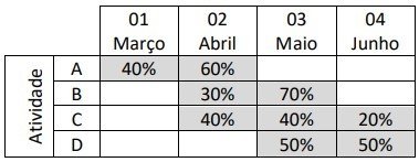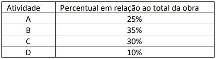 Um serviço de engenharia com valor total de R$ 160.000,00 foi projetado para ser executado em quatro meses. O serviço é composto de quatro atividades, seguindo o cronograma físico-financeiro que está apresentado abaixo, onde estão discriminados os percentuais de execução das atividades previstos para cada mês.
