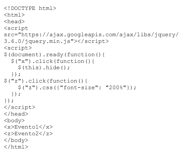 b) A biblioteca JQuery tem como propósito facilitar a escrita de código em JavaScript por meio dos seus métodos. Descreva o resultado da execução do seguinte código.