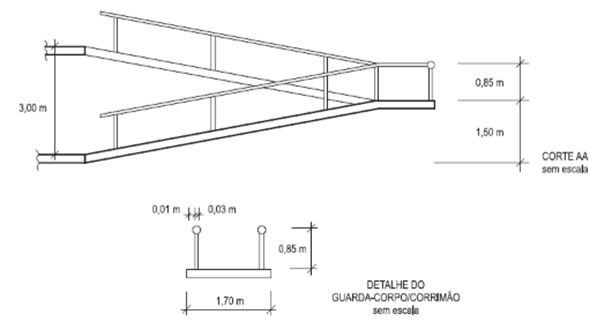 Um engenheiro foi solicitado a elaborar um parecer sobre as condições de uma rampa externa em rota acessível, executada em um edifício recém-construído. Visitando o local, ele verificou que a largura da rampa atendia ao fluxo de pessoas e que não havia inclinações transversais nem paredes laterais, mas guarda-corpos metálicos em ambos os lados, firmemente fixados ao piso.