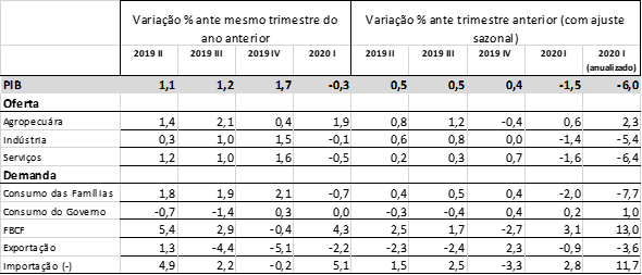 A economia brasileira contraiu 1,5% no 1º trimestre de 2020 em comparação com o trimestre anterior, ajustado sazonalmente. Em comparação com o mesmo período de 2019 a queda foi de 0,3%.