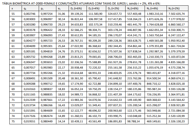 - Tábuas biométricas: AT-2000-Male (sexo masculino) e AT-2000-Female (sexo feminino);