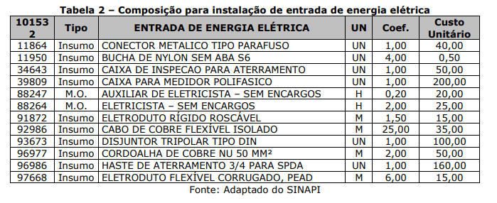 - O preço de venda dos insumos para instalação de duas entradas de energia elétrica, considerando que o BDI seja de 25% e os encargos sociais sejam de 100%; e