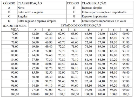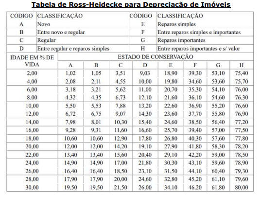 Para o cálculo da reedição da benfeitoria, o avaliador fundamentou sua análise da depreciação física no método de Ross-Heidecke, que leva em consideração a idade e o estado de conservação no momento da vistoria. As tabelas necessárias ao método estão apresentadas a seguir: