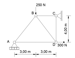 Em face dessas considerações, elabore um texto dissertativo discorrendo sobre a determinação da reação de apoio no nó A, das intensidades e dos tipos dos esforços normais (compressão ou tração) nos membros AB e AD da treliça abaixo, utilizando o Método dos Nós, a partir do nó A. Sabe-se que as solicitações ilustradas abaixo são forças de 250 N no nó B e de 300 N no nó D.