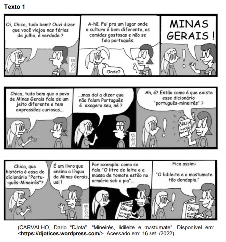 Supondo que um(a) professor(a) de Português se deparou com a tirinha de Djota (Texto 1) e decidiu usá-la para discutir a noção de variedade linguística com base na definição desse tema apresentada pelo linguista Marcos Bagno (Texto 2) com uma turma do 1º ano do Ensino Médio, responda fundamentadamente: