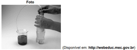 Para demonstrar a influência do CO2(g) no pH da água, um professor fez o seguinte experimento: Adicionou aproximadamente 150 mL de água destilada em um béquer e uma pitada do indicador vermelho de fenol (faixa de viragem: do pH 6,8, amarelo, para pH 8,4, vermelho). Em seguida, adicionou uma ponta de espátula de bicarbonato de sódio e agitou. A solução adquiriu cor vermelha. Em uma garrafa, adicionou aproximadamente 350 mL de água e alguns comprimidos efervescentes. Tampou-a rapidamente colocando a extremidade de uma mangueira acoplada à tampa dentro do béquer com a solução vermelha para borbulhar o gás carbônico (foto). A solução se tornou alaranjada.