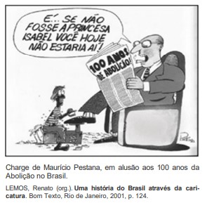 a. Indique como a charge poderia ser utilizada como material didático, considerando que ela faz referência ao Centenário da Abolição.