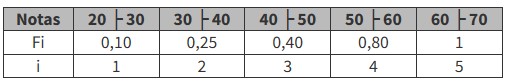 Num concurso para Analista Estatístico as notas finais estão descritas na tabela abaixo. Os dados apresentados representam a faixa de notas e a frequência acumulada relativa dos candidatos que realizaram o concurso.