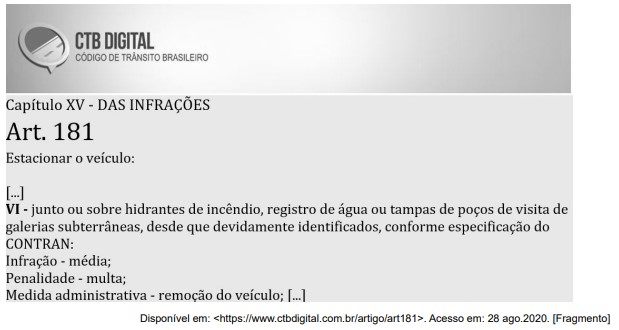 Disponível em: http://g1.globo.com/mg/zona-da-mata/noticia/2017/02/carro-estacionado-em-frente-hidrante-atrapalha-bombeiros-em-mg.html#:~:text=De%20acordo%20com%20o%20%C3%B3digo,soma%20quatro%20pontos%20na%20carteira.