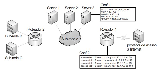 C conf 1 e conf 2 mostram, respectivamente, trechos da configuração do serviço de rede específico do Server 3 e regras de controle de acesso (ACLs) do roteador 1 aplicadas ao tráfego entrante;