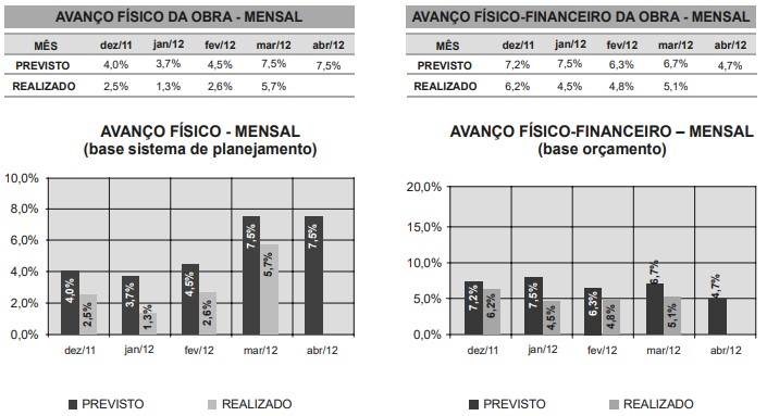 As tabelas e os gráficos abaixo mostram os percentuais mensais de avanço físico e físico-financeiro do empreendimento hipotético X.