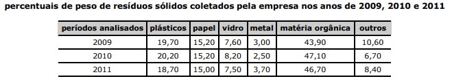 < Com base nos dados apresentados na tabela, identifique o tipo de resíduo sólido rejeitado — plástico ou matéria orgânica — que mais sofreu redução de peso nos anos de 2010 e 2011.