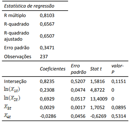 Admita-se que foram verificadas todas as hipóteses do Modelo de Regressão Linear Clássico – MRLC. Os resultados obtidos encontram-se nas tabelas a seguir.